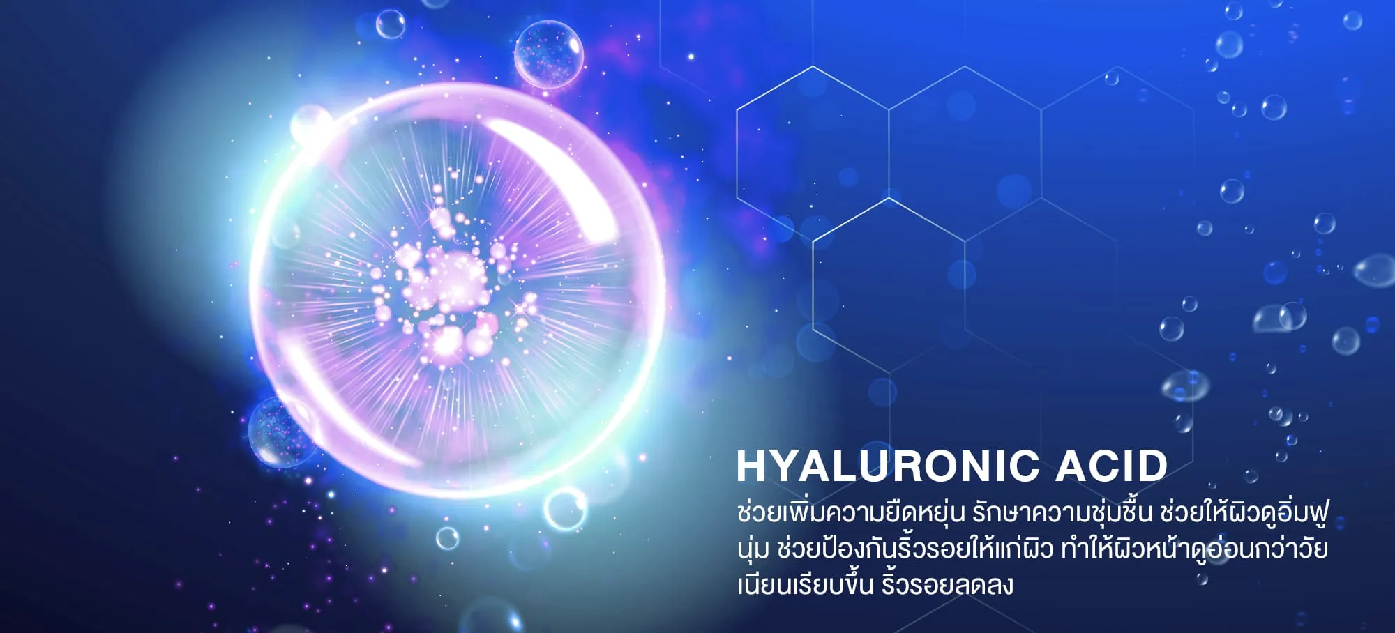 Hyaluronic Acid มีคุณสมบัติเด่นในด้านการอุ้มน้ำได้ดี จึงช่วยเพิ่มความยืดหยุ่น รักษาความชุ่มชื้น ช่วยให้ผิวดูอิ่มฟู นุ่ม ช่วยป้องกันริ้วรอยให้แก่ผิว เช่น ริ้วรอยที่ร่องแก้มหรือบริเวณรอบดวงตา ส่งผลให้ผิวหน้าดูอ่อนกว่าวัย เนียนเรียบขึ้น ริ้วรอยลดลง มีความนุ่มนวลเมื่อสัมผัส อันเกิดจากผิวที่ได้รับความชุ่มชื่นที่เพียงพอ