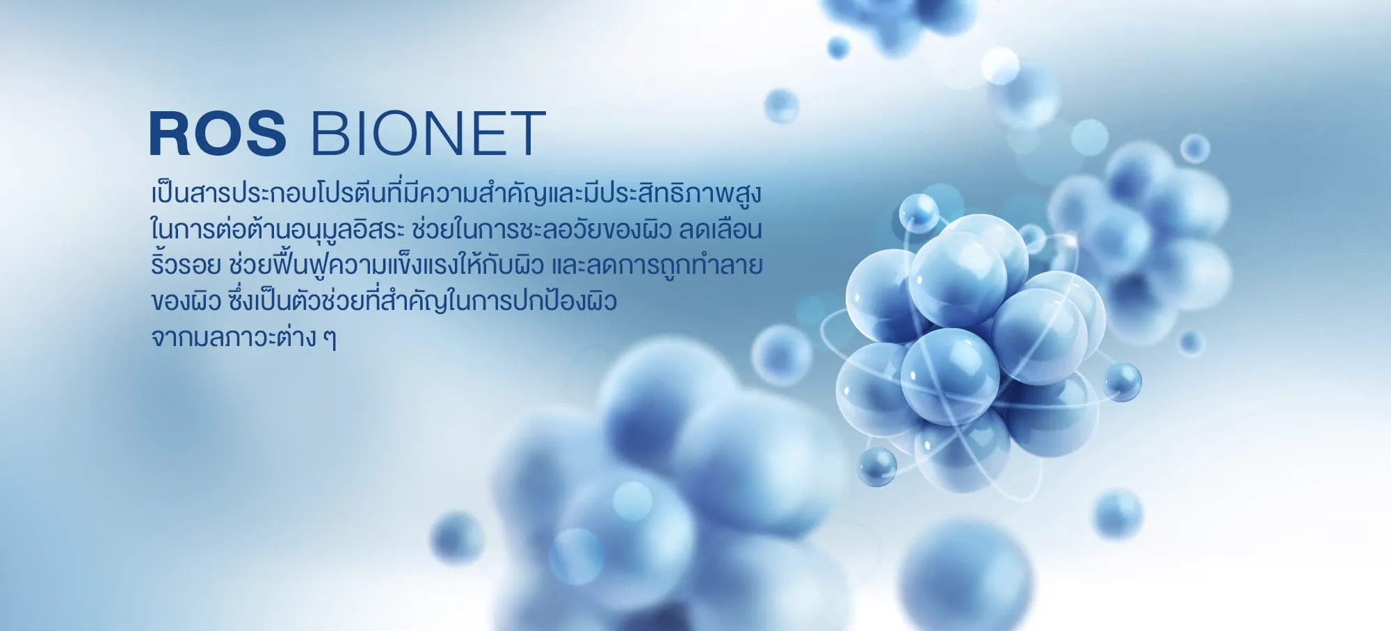 ROS Bionet เป็นสารประกอบโปรตีนที่มีความสำคัญและมีประสิทธิภาพสูงในการต่อต้านอนุมูลอิสระ ช่วยในการชะลอวัยของผิว ลดเลือนริ้วรอย ช่วยฟื้นฟูความแข็งแรงให้กับผิว และลดการถูกทำลายของผิว ซึ่งเป็นตัวช่วยที่สำคัญในการปกป้องผิวจากมลภาวะต่าง ๆ