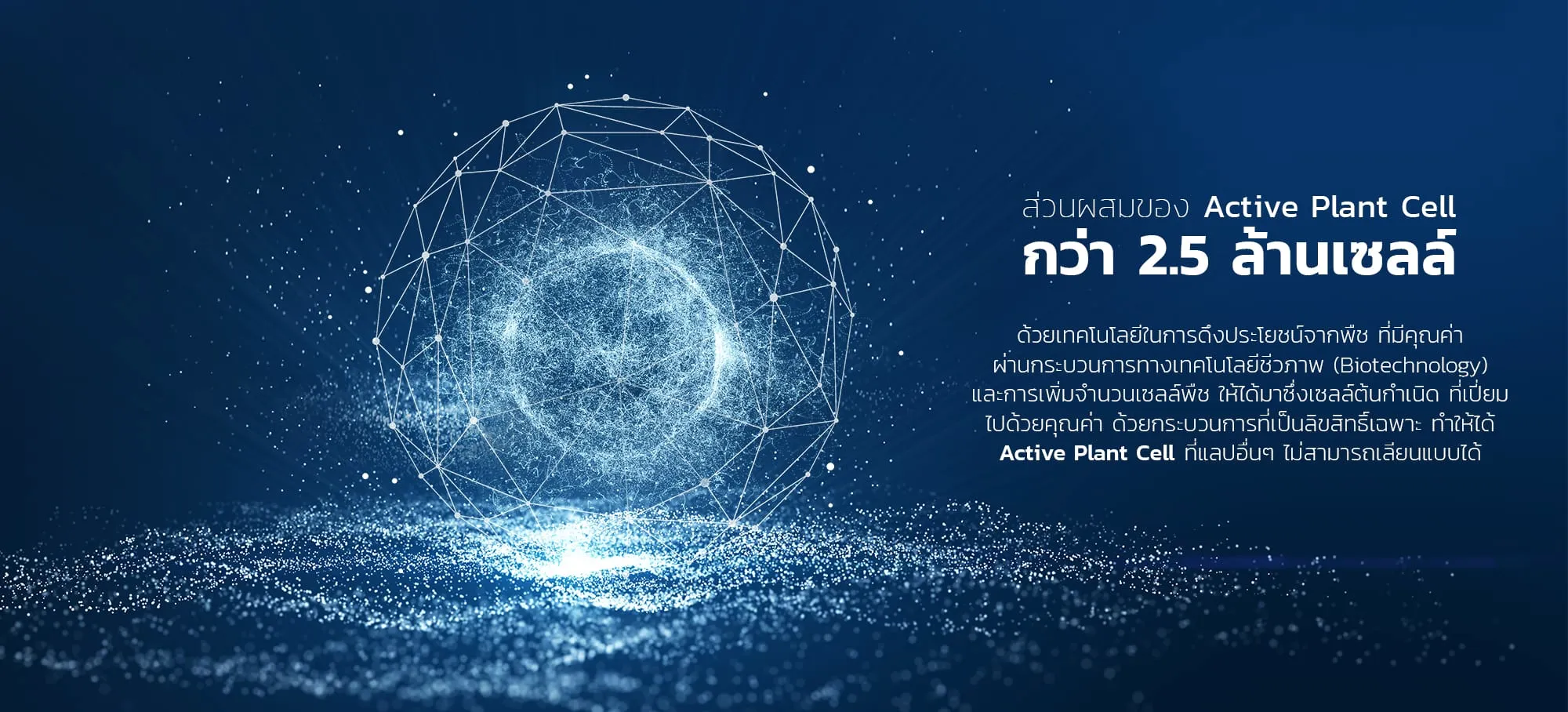 Active Plant Cell กว่า 2.5 ล้านเซลล์ ด้วยเทคโนโลยีในการดึงประโยชน์จากพืชหายากมาใช้ โดยคัดสรรเฉพาะพืชที่มีคุณค่า พืชในตำนาน พืชหายาก มาผ่านกระบวนการทางเทคโนโลยีชีวภาพ (Biotechnology) ส่งต่อไปยังขบวนการเพิ่มจำนวนเซลล์พืช (Cell Culture) เพื่อให้ได้มาซึ่งเซลล์ต้นกำเนิดที่เปี่ยมไปด้วยคุณค่าของสารออกฤทธิ์ที่สำคัญมากมายดุจได้สารสกัดจากต้นไม้นั้น ๆ ทั้งต้น ด้วยกระบวนการที่เป็นลิขสิทธิ์เฉพาะทำให้ได้ Active Plant Cell ที่แลปอื่น ๆ ไม่สามารถเลียนแบบได้