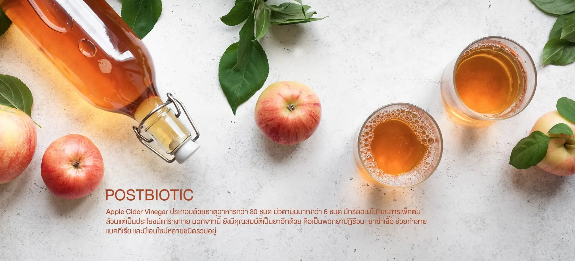 ประกอบด้วยส่วนผสมหลัก ได้แก่ เชื้อจุลิทรีย์ 10 สายพันธุ์ ใยอาหาร 4 ชนิด ผงแอปเปิ้ลไซเดอร์ วีเนการ์ และสารสกัดจากแคนเบอร์รี่